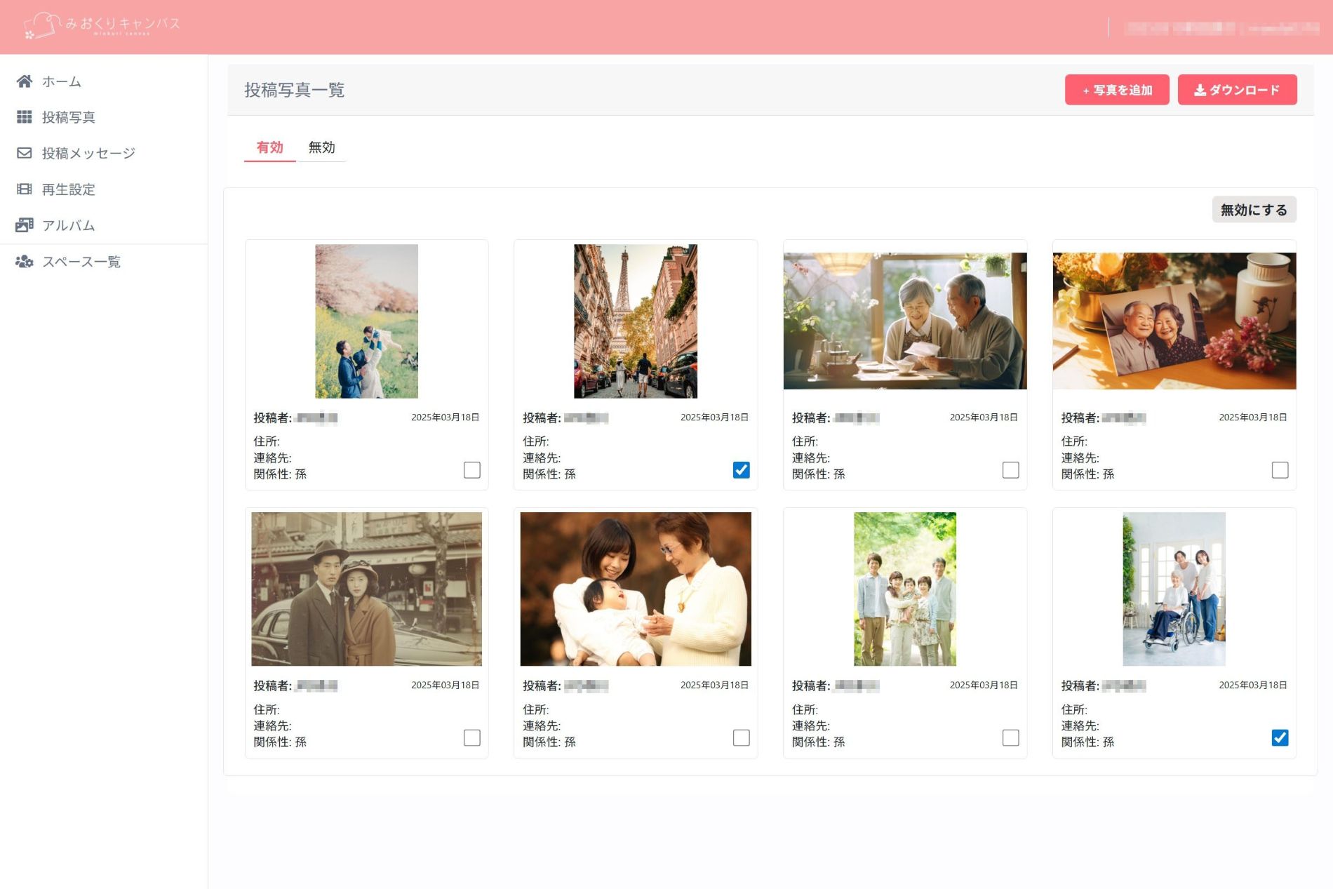 2、投稿で集まった写真・メッセージの中から、再生に使用したい写真を選びます。枚数が多かったり、適切ではない写真があったりする場合は無効にすることができます。 チェックボックスをクリックした後、画面右上にあるボタンから有効・無効を切り替えることができます。