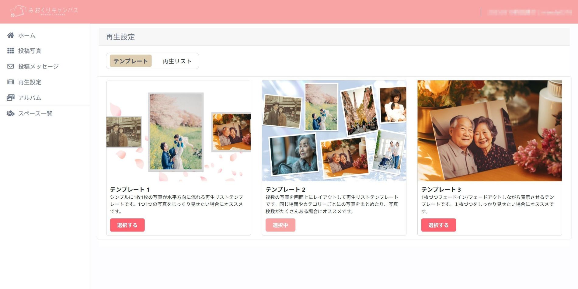テンプレートは「シンプルでゆっくりタイプ」、「複数の写真を画面上にレイアウトできるカジュアルタイプ」、「落ち着いたフォーマルタイプ」の3種類から選ぶことができます。